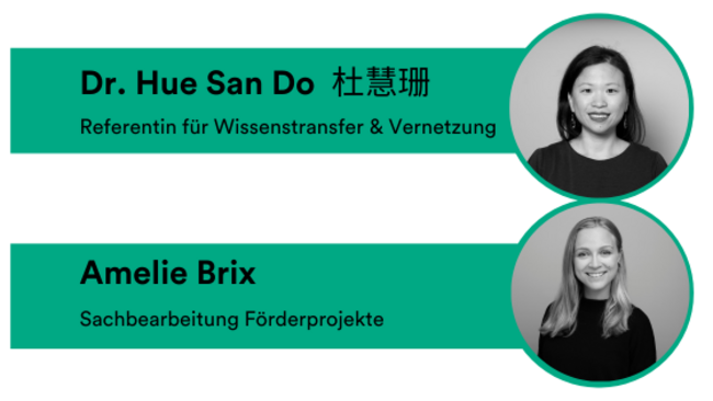 - Reise- und Übernachtungskosten für max. zwei Mitarbeitende des Projekts zu einer Netzwerkveranstaltung des Bildungsnetzwerks China in Berlin, die 1x im Jahr stattfindet, können optional durch die Förderung abgedeckt werden.