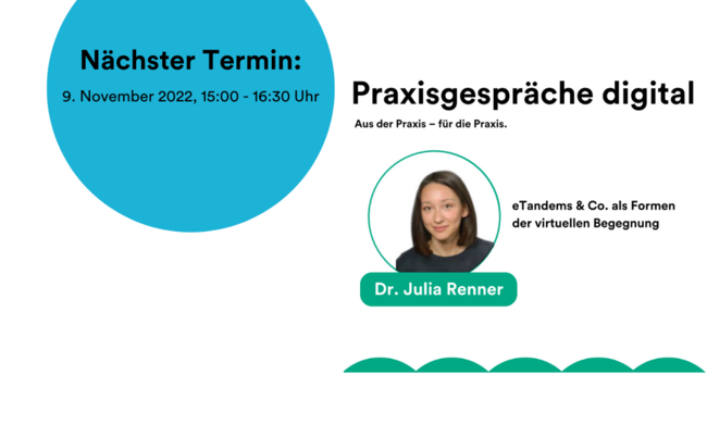 Das zweite digitale Praxisgespräch mit Dr. Julia Renner, findet am 09. November von 15:00 - 16:30 zum Thema "eTandems & Co. als Formen der virtuellen Begegnung " statt.