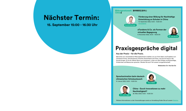 Menschen aus verschiedenen Bildungsbereichen erzählen uns von ihren Ideen und Projekten zum Chinesisch lernen, Schulaustausch zwischen Deutschland und China, und wie sie China in die Schule bringen. Es ist ein offener Raum zum Austausch, in dem wir über Erfolge und Rückschläge, Hindernisse und Ressourcen sprechen.