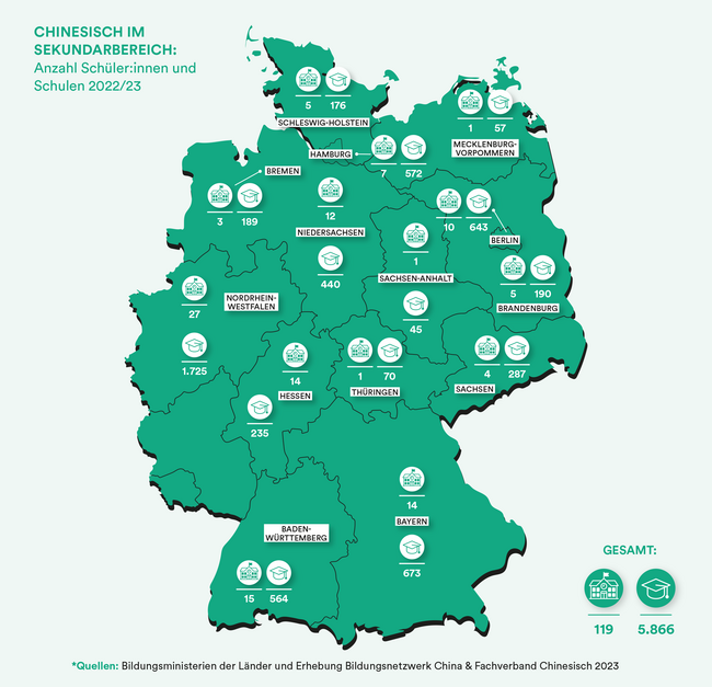 Das Bildungsnetzwerk China und der Fachverband Chinesisch e. V. führten im Herbst 2023 eine Erhebung zu den Chinesisch-Angeboten im Schulbereich durch. Wir präsentieren Ihnen auf dieser Seite die Ergebnisse als Zusammenfassung (Fact Sheet als PDF). Der vollständige Bericht wurde in der Fachzeitschrift "CHUN - Chinesischunterricht (39/2024)" veröffentlicht (Artikel als PDF).