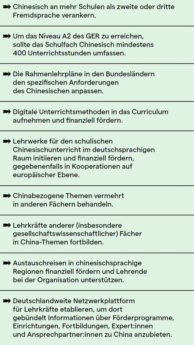 Wenn dem Niveau A2 des Gemeinsamen Europäischen Referenzrahmens (GER) vergleichbare Chinesischkenntnisse angestrebt werden, sollten Schüler:innen mindestens 400 Unterrichtsstunden in Chinesisch erhalten – das sind bei drei Schulstunden pro Woche etwa vier Schuljahre. Daher ist es wichtig, früh anzufangen und das Fach Chinesisch konsequent und mit eigenständigen Konzepten in der deutschen Schullandschaft zu beheimaten, als Ausgangsbasis für eine Vertiefung von China-Kompetenz im Erwachsenenleben.