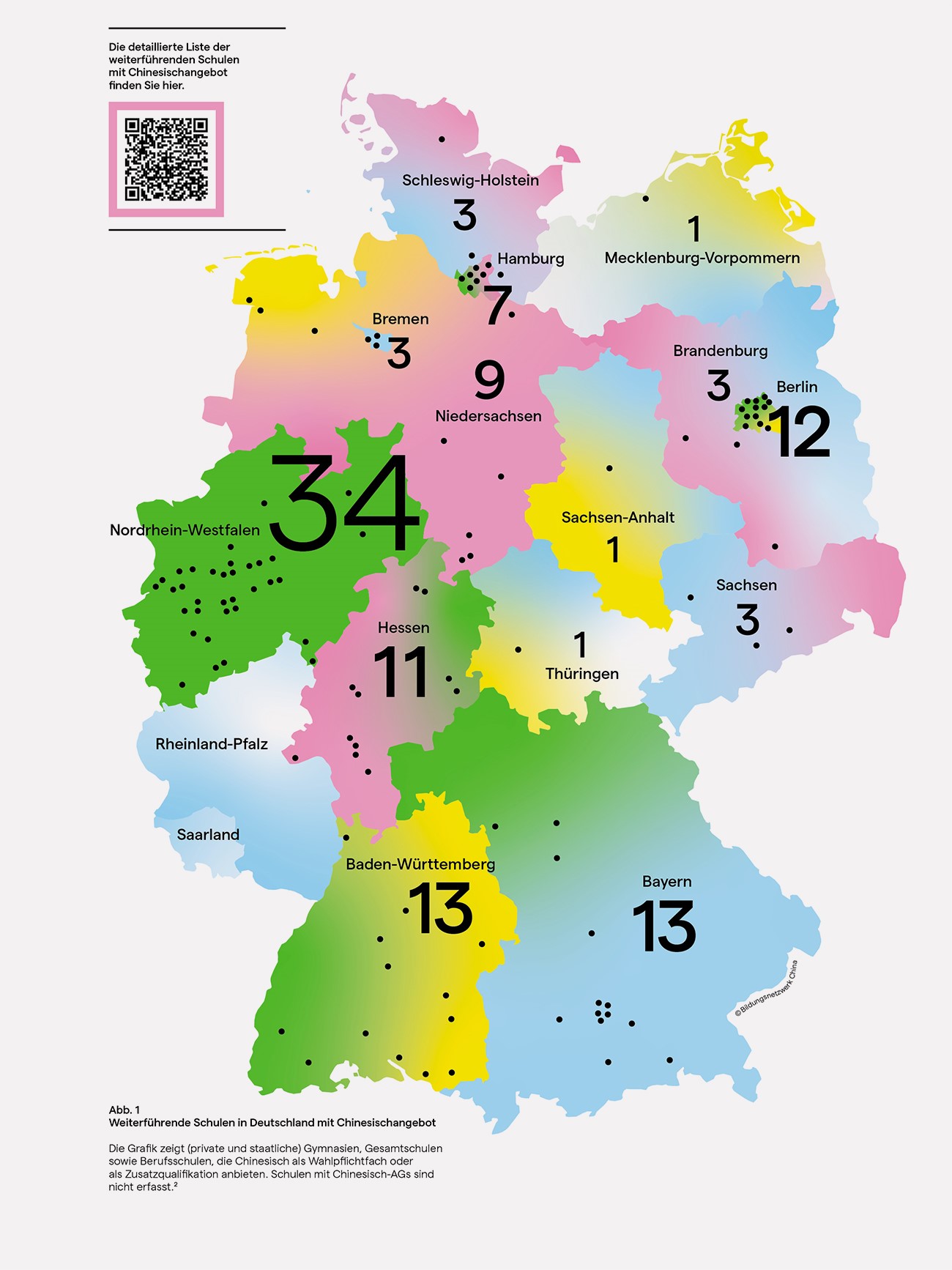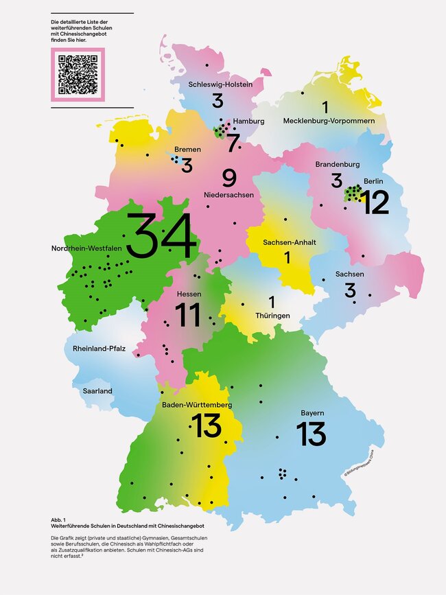 Das Thema China wird in deutschen Schulen nicht zuletzt über die Sprache vermittelt. Das relativ junge Unterrichtsfach Chinesisch hat sich seit den 1990er Jahren zunehmend entwickelt und verbreitet. Immerhin wurde laut Fachverband Chinesisch im Jahr 2020 an 121 weiterführenden Schulen in Deutschland Chinesischunterricht als Wahlpflichtfach angeboten. Nordrhein-Westfalen führt als größtes Bundesland die Liste mit 34 Schulen an, danach folgt Baden-Württemberg mit 13. Überraschend ist, dass in Berlin (12) fast genauso viele Schulen Chinesisch im Curriculum haben wie in ganz Bayern (13). Es gibt aber auch Bundesländer, wo das Wahlpflichtfach Chinesisch noch nicht existiert (Abb. 1).
